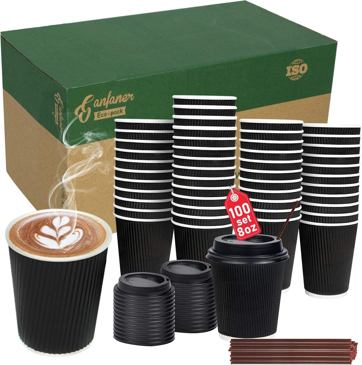Ganfaner 100set 8 oz Disposable Paper Coffee Cups with Snug Lid & Straw, Insulated Ripple Double-Wall Paper Cup Refillable, Perfect for To Go Travel Mug, Party and More[White]