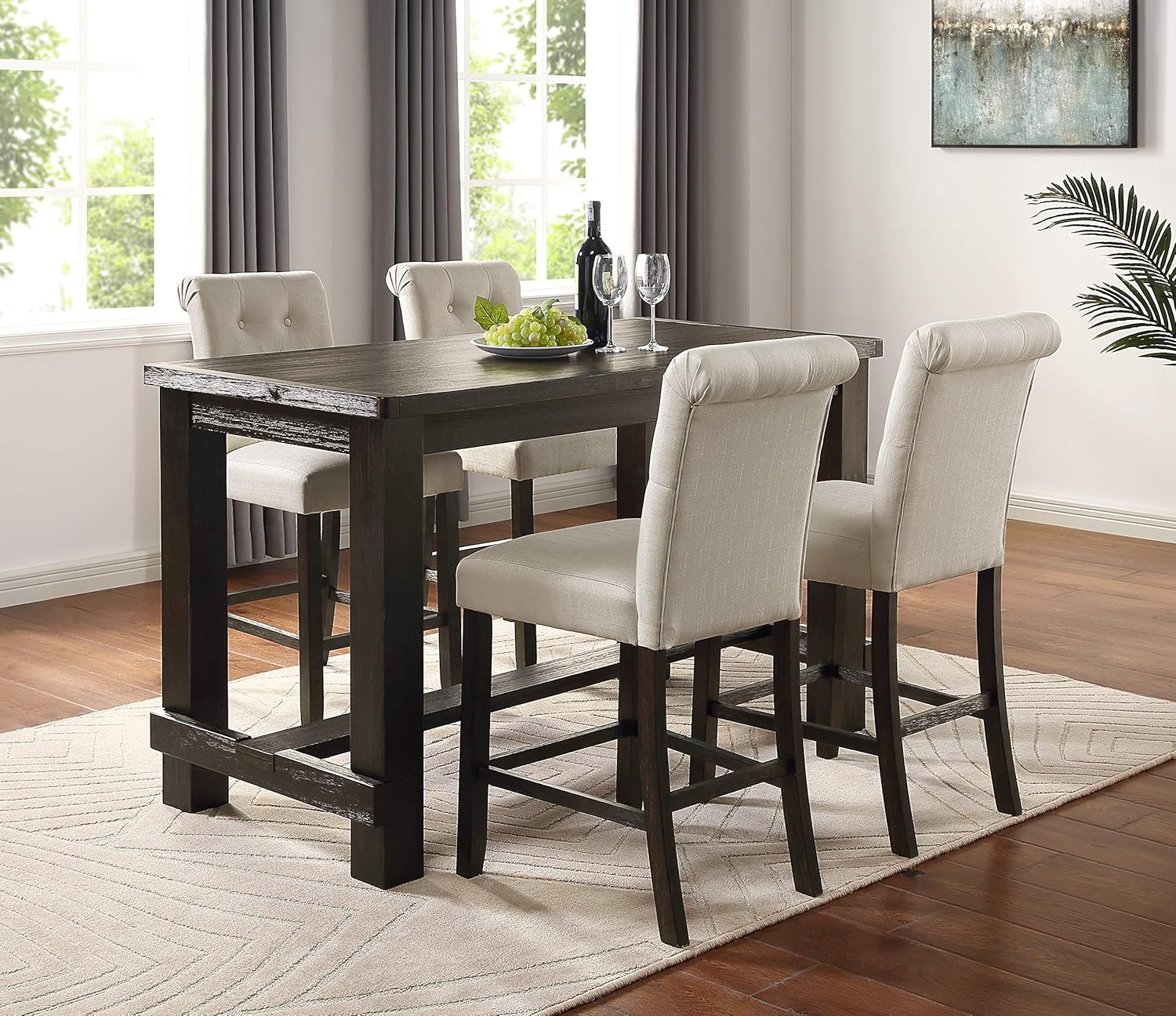Inspired by the sheer simplicity and weatherworn beauty of primitive furniture, Aneta Antique Black Finished Wood Counter Height Dining Set brings a relaxed sense of style into your space. It provides an ample amount of seating, making it a versatile option that can accommodate both your family and guests. Enjoy cozy, intimate dinners and gatherings around the beautiful dining table. The Aneta Dining Chairs offers a simply elegant design and is upholstered in soft solid color fabric with solid wood frame, perfectly accented with button tufting.