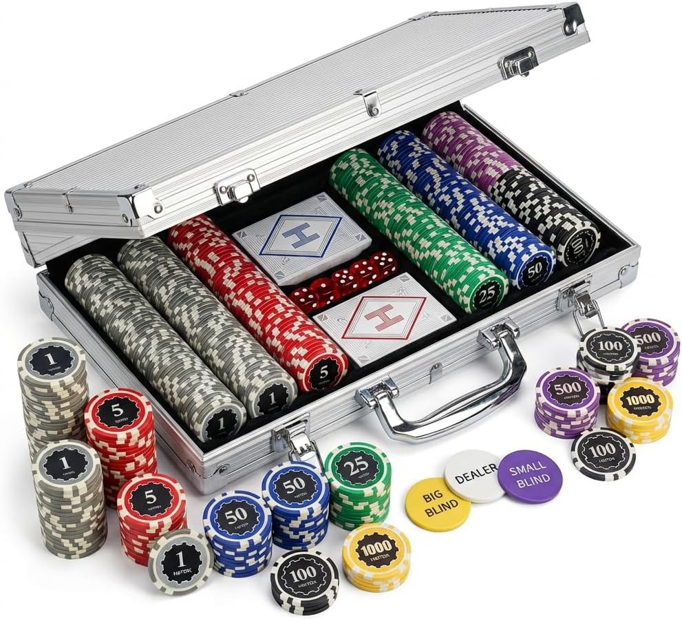 Bring the thrill of a real poker game to your homeThe HEITOK 500 Poker Chips Set is designed for game nights, family gatherings, and lively parties. Each chip is 11.5g, made from double-injection iron composite with clear denominations for an authentic professional feel. The set includes 2 decks of cards, 5 dice, and all essential dealer buttons for Texas Hold'em, Blackjack, and more.Contains:1. 500 Poker Chips Set2. $1 (150 gray Chips), $5 (100 red Chips), $25 (100 green Chips), $50 (50 blue Chips), $100 (50 black Chips), and $500 (25 purple Chips), and $1000 (25 yellow Chips)3. 5 precision dice4. 2 decks of playing cards5. Big Blind, Small Blind, and Dealer Chips6. 1 sturdy aluminum carrying caseSatisfactory SizeEach chip is 11.5g weighted, 1.5" diameter, 1/8" thick. Scientifically balanced for a realistic professional-grade feel, ensuring smooth gameplay every round.Double Injection Iron CoreThe chips in this premium set are built from durable materials to withstand frequent play, keeping their integrity and authentic touch for years of use.Classic Touch and Vibrant ColorsThe tactile sensation and vivid colors make chip recognition effortless while adding elegance to your poker table—suitable for enhancing any game night atmosphere.Portable Aluminum CasePacked in a tough aluminum case, this set offers secure storage, easy organization, and hassle-free transport—convenient to carry for home or travel use.Suitable for 9–10 PlayersWith a scientifically balanced 300-chip ratio, this set works well for 9–10 players. Whether you're a beginner or an experienced player, it provides professional-quality gaming right to your tabletop.