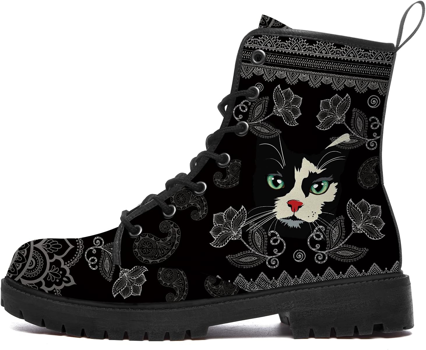 【Boots Material】 - Eco-friendly faux leather - Midsole:Classic stitching at midsole - Insole: Cushioning insole - Outsole: Rubber outsole 【Boots Feature】 - Heel Height: 1.3" inch - Toe: Round Toe - Color:Black - Closure: Lace up front with metal eyelets - Easy On and Off: Pull loop at collar for easy on and off - Boots Height Map: Ankle High - Boots Style: Combat Boots - Gender: Women,Men,Girls,Boys - Waterproof;Slip resistant - Design: DIY Custom Design - Occasion: For everyday work,walking, hiking, camping, across the rugged scenery outside 【Package】 1 * Combat Ankle Boots packaged with boots box. [Boots Sizing Chart] 3 Men/4.5 Women = EU 35 = 8.94inch 3.5 Men/5 Women = EU 35.5 = 9.09inch 4 Men/5.5 Women = EU 36 = 9.25inch 4.5 Men/6 Women = EU 36.5 = 9.41inch 5 Men/6.5 Women = EU 37 = 9.61inch 5.5 Men/7 Women = EU 38 = 9.76inch 6 Men/7.5 Women = EU 39 = 9.92inch 6.5 Men/8 Women = EU 39.5 = 10.12inch 7 Men/8.5 Women = EU 40 = 10.28inch 7.5 Men/9 Women = EU 40.5 = 10.43inch 8 Men/9.5 Women = EU 41 = 10.63inch 8.5 Men/10 Women = EU 42 = 10.79inch 9 Men/10.5 Women = EU 42.5 = 10.98inch 9.5 Men/11 Women = EU 43 = 11.10inch 10 Men/11.5 Women = EU 44 = 11.29inch 10.5 Men/12 Women = EU 44.5 = 11.49inch 11 Men/12.5 Women = EU 45 = 11.61inch 11.5 Men/13 Women = EU 45.5 = 11.77inch 12 Men/13.5 Women = EU 46 = 11.97inch 13 Men/14 Women = EU 47= 12.13inch [Warm Tips] Please refer to our boot size chart before purchase to confirm the size according to your foot length. If your feet are thick or wide, please choose one bigger size.