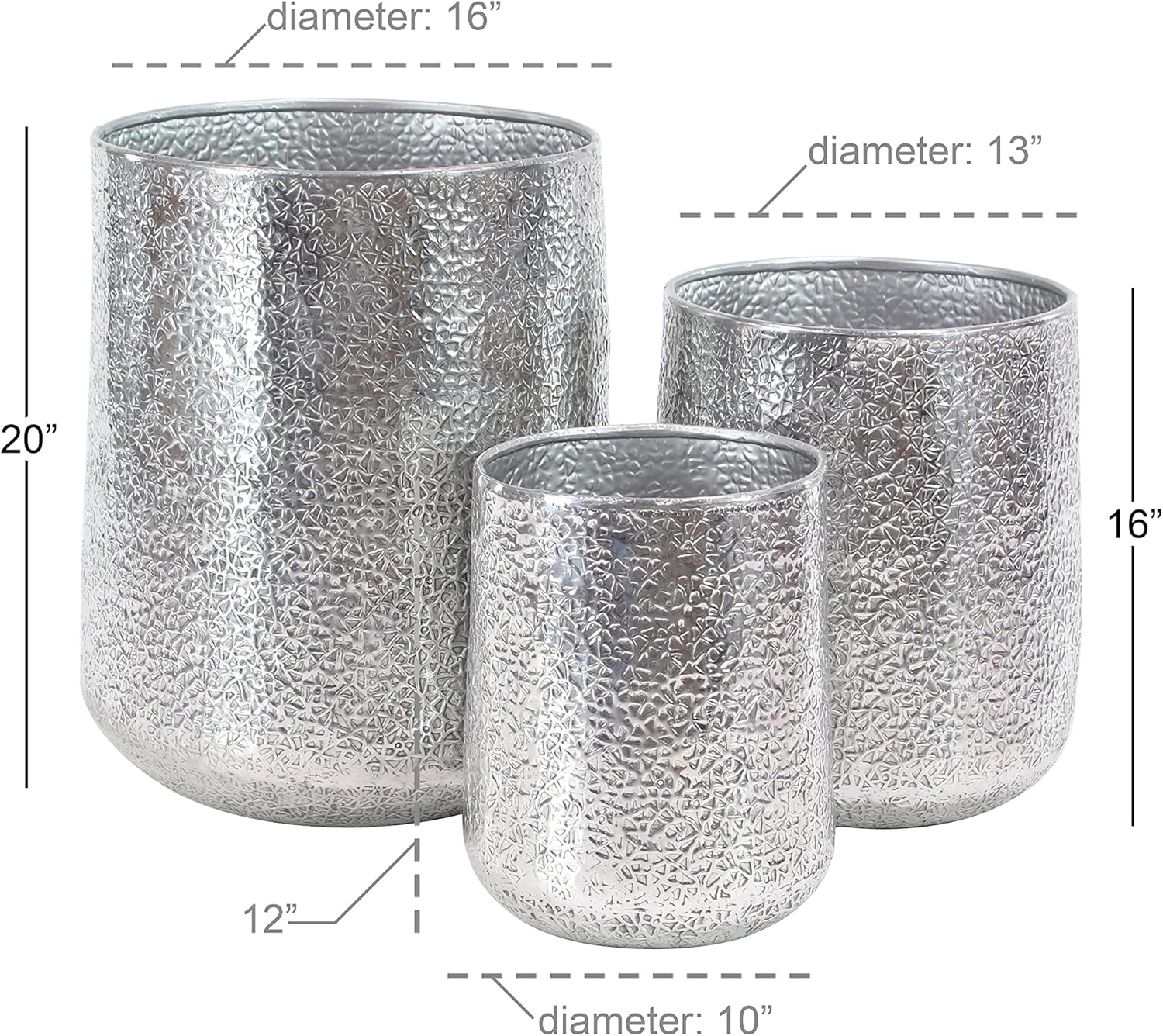 Silver set of 2 large planter pots are versatile enough to be used in various settings, from living rooms to office spaces or outdoor patios. This item ships in 1 carton. Please note that this item is for decorative purposes only and is not food safe. Suitable for indoor and outdoor use. This item ships fully assembled in one piece. Maximum weight limit is 30 lbs. Made in India. No drainage holes. This silver colored aluminum plant pot comes as a set of 3. Glam style.