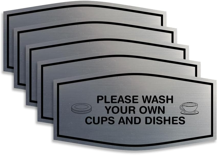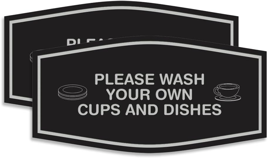 Promote shared responsibility and keep communal spaces tidy with the Fancy "Please Wash Your Own Cups and Dishes" Sign. Designed with an elegant aesthetic, this sign delivers a polite yet clear reminder for everyone to clean up after themselves in shared kitchens, break rooms, or office lounges. Its decorative style adds charm while maintaining professionalism, making it suitable for both workplace and residential environments. Crafted from durable materials, the sign resists everyday wear and retains its stylish appearance over time. Installation is quick and easy with the included adhesive backing—just peel and press onto any clean, smooth surface such as walls, cabinets, or backsplash areas. Available in multipacks to maintain consistency across multiple locations or rooms.