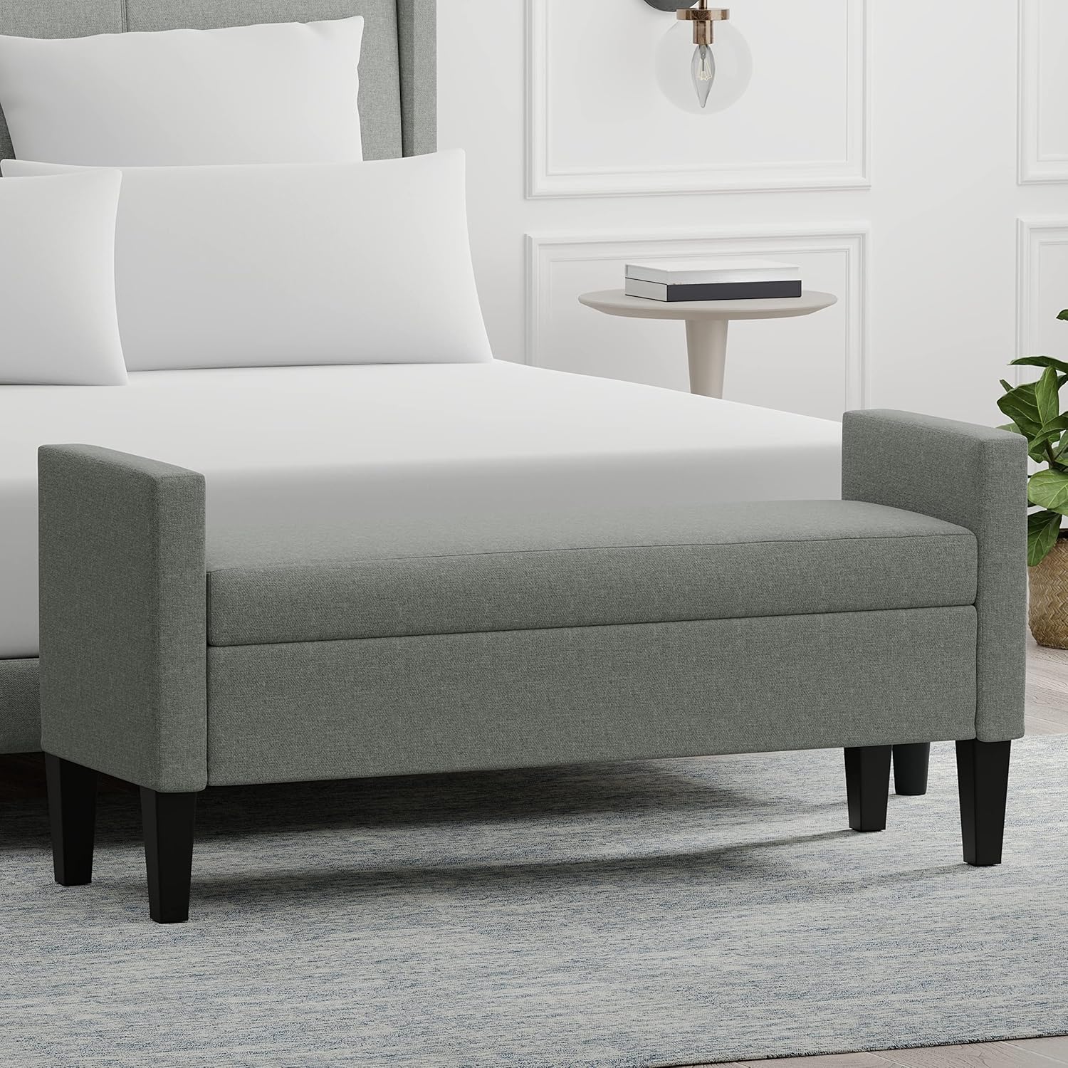 An inviting modern bench, this upholstered storage ottoman strikes a contemporary silhouette with two-track arms and four solid wood square tapered legs. While a foam-filled cushion and arms provide added comfort and support. Just lift up the seat for hidden and functional storage - perfect to stash hats, gloves in an entryway or sheets and blankets in a bedroom. Available in three widths: 42", 46", and 52" with and without nickel plated nailhead trim.