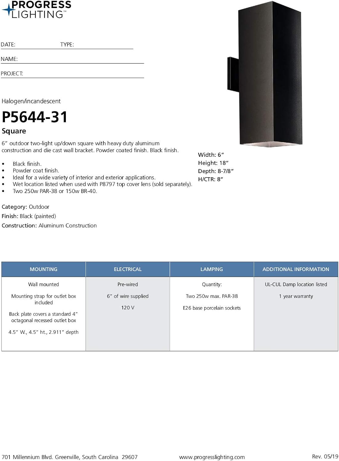 Product Description Embrace minimalist design without settling for boring decor with the Square Collection 2-Light Black Modern Up/Down Wall Lantern. Light sources glow from within a sophisticated rectangular shade that exudes stylish simplicity. The heavy-duty aluminum die-cast frame is coated in a beautiful black powder coat finish that accentuates the wall light's modern aesthetic. For ideal illumination, use 1 medium base bulbs that are sold separately (250w max - LED/CFL/incandescent). The wall lantern is compatible with dimmable bulbs. The wall lantern's minimalist design is ideal for any porch, patio, deck, garage, barn, foyer, or bedroom in modern and transitional style settings. Wet location approved if used with lens cover (P860047-031). It's time to breathe new life into the mundane every day with timeless and truly transformative lighting. Make your purchase today to begin your journey to a whole new lighting experience. Progress Lighting products are designed for exceptional quality, reliability, and functionality From the Manufacturer 6-Inch square cylinder with heavy duty aluminum construction and die cast wall bracket. Sleek design offers a superior low-profile option for lighting building exteriors. Features 2-Light configuration which illuminates both up and down - creating a dramatic lighting effect. Powder coated finish. 6-Inch up/down square with heavy duty aluminum construction and die cast wall bracket. Powder coated finish. Uses (2) 150-Watt BR-40 bulbs 6-Inch Width by 18-Inch Height May also use 250-Watt PAR-38 lamp UL Listed for indoor use as shown. For UL Wet Location use, accessory lens, P8797-31, is required - order separately.