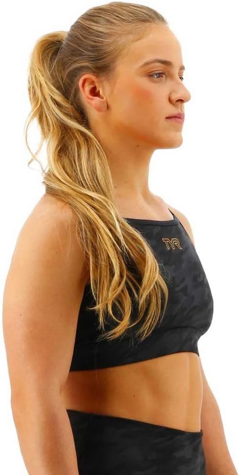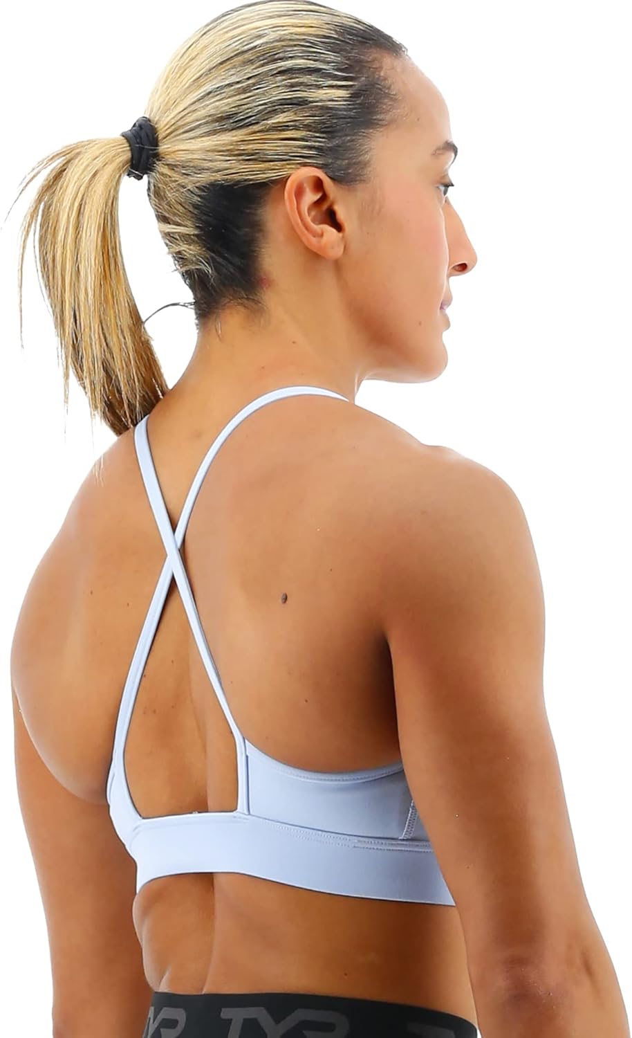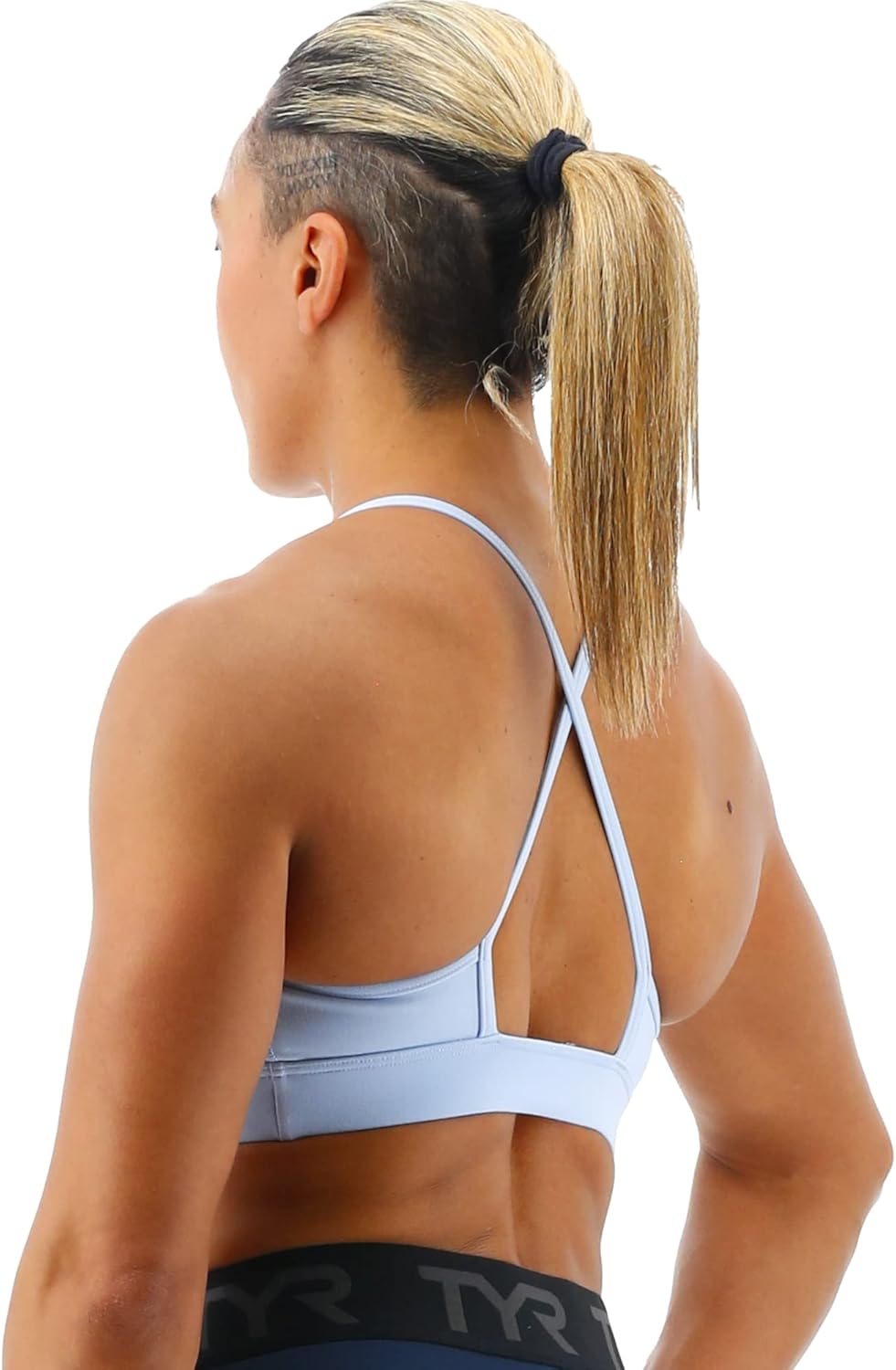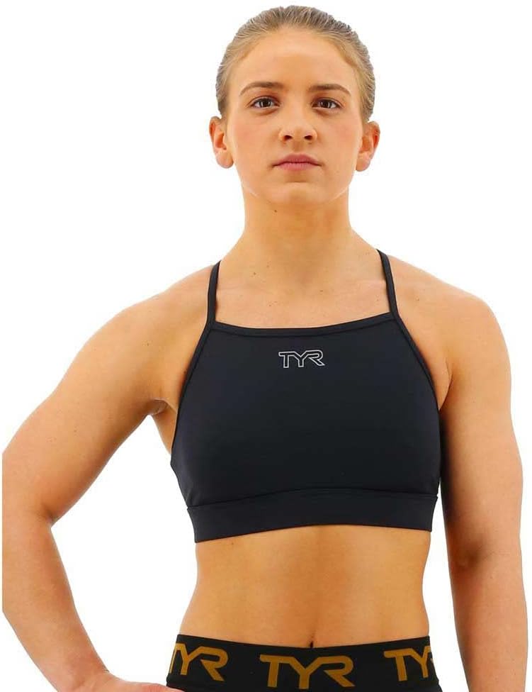 Train hard and train smart in the TYR High Neck Sports Bra. With breathable and moisture wicking Kinetic Fabric Technology, a stay-in-place band and supportive cross-back design, this Sports Bra is made to keep you moving. Features: - Supportive thin strap design - No-Slip bottom band - Moisture wicking - Quick dry