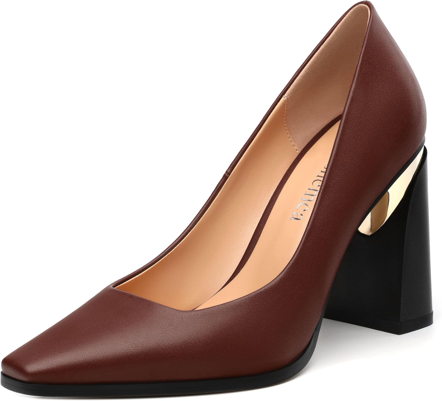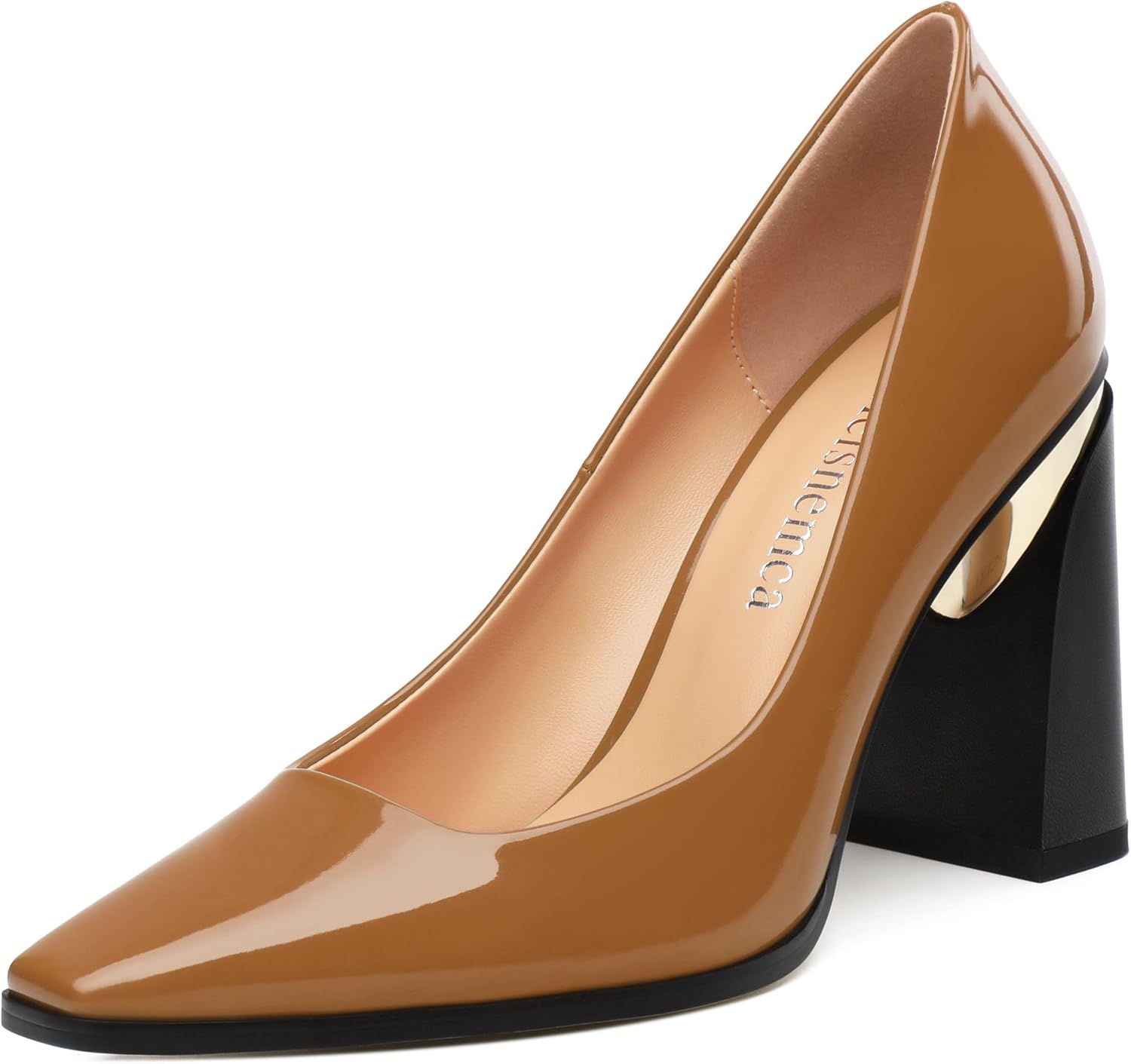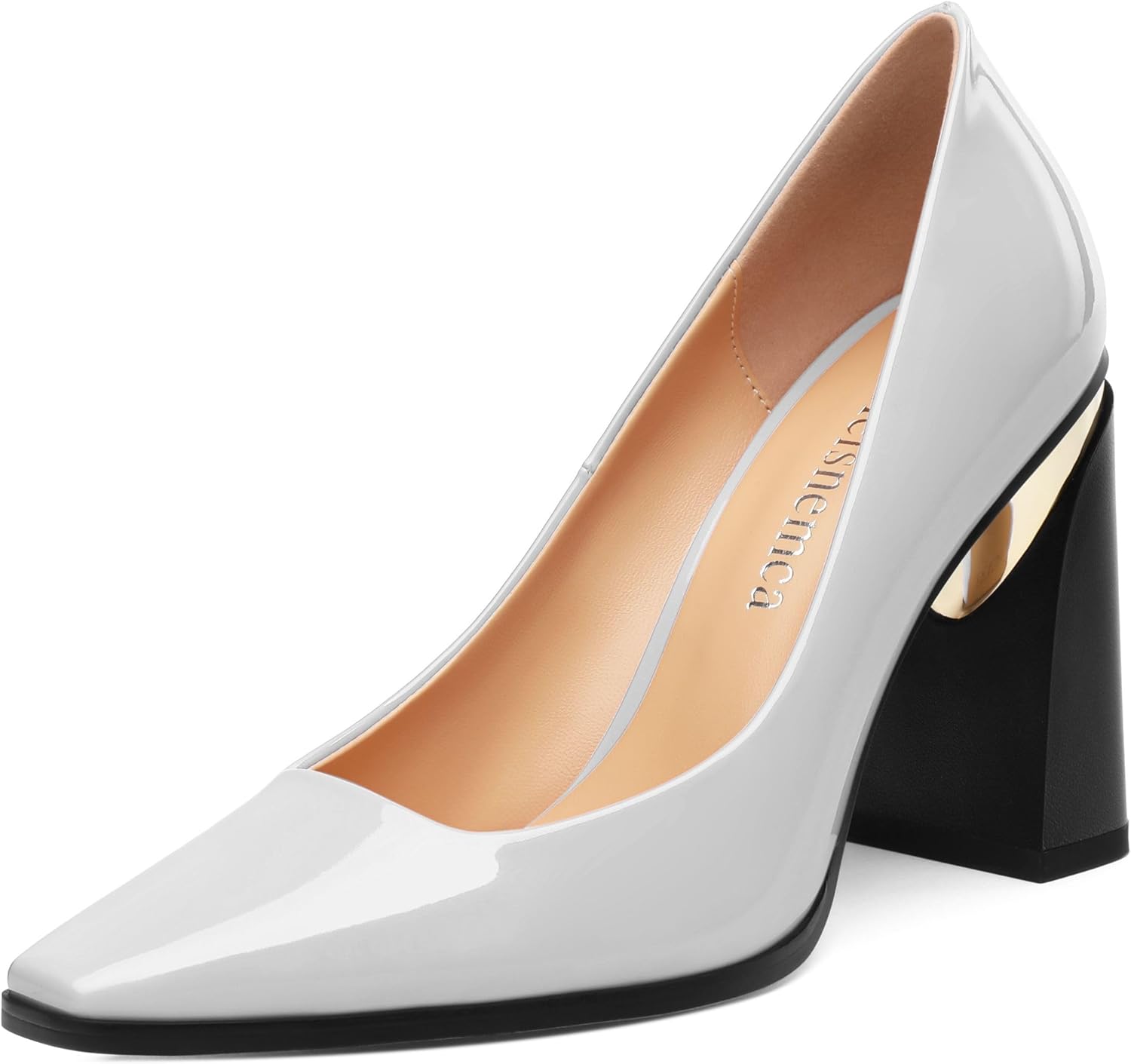 Heisnemca Womens High Heels,Patent Closed Square Toe Slip on Chunky Block Pumps,elegant Heels,daily Wedding Party Dress Shoes 3.5IN